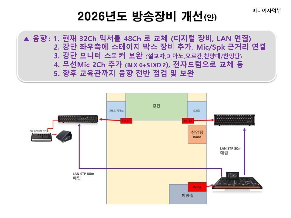 - 제일 중요한 음향 믹서(디지털)를 이번에 교체합니다. 부족한 채널 수를 48채널로 늘려 추가되는 무선 마이크, 전자드럼, 싱어용 마이크, 모니터 스피커 보강 등에 할당할 예정 입니다.